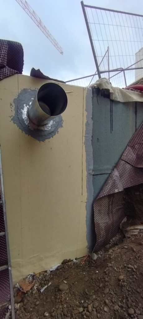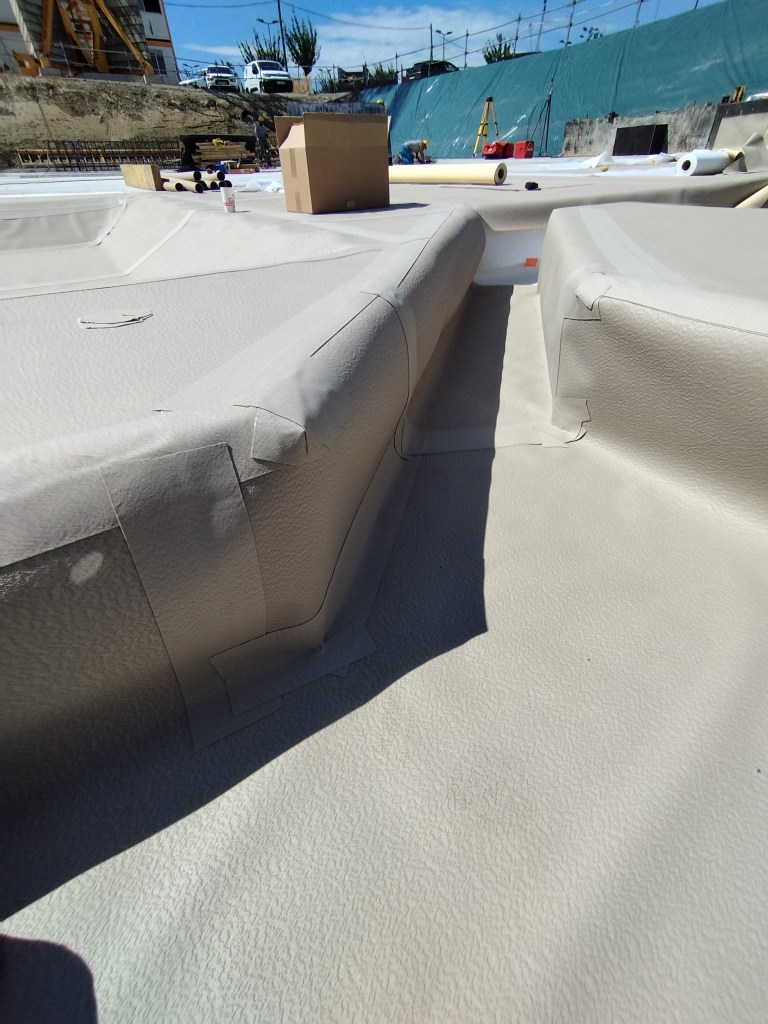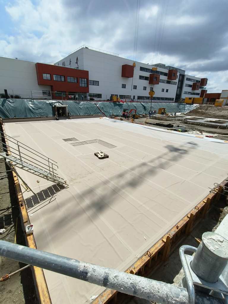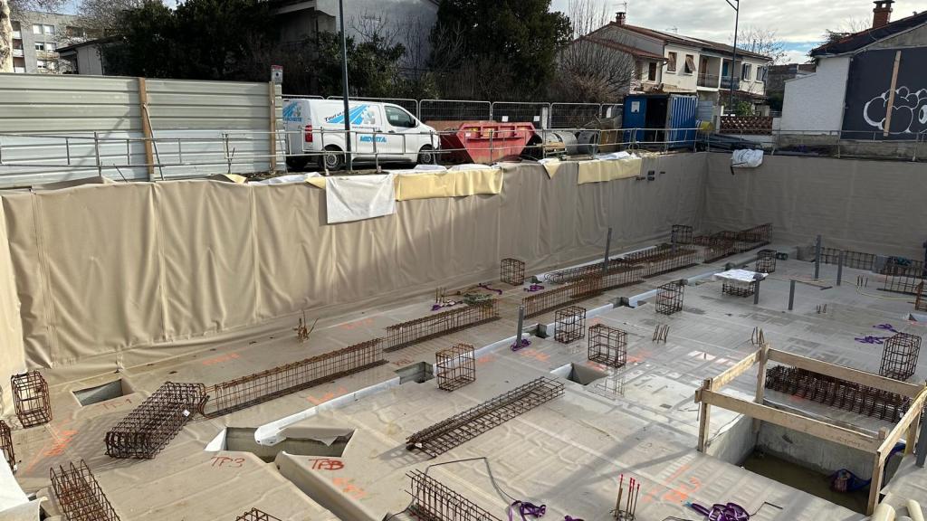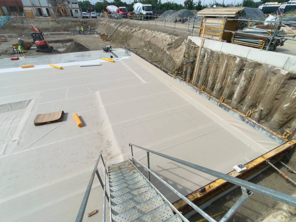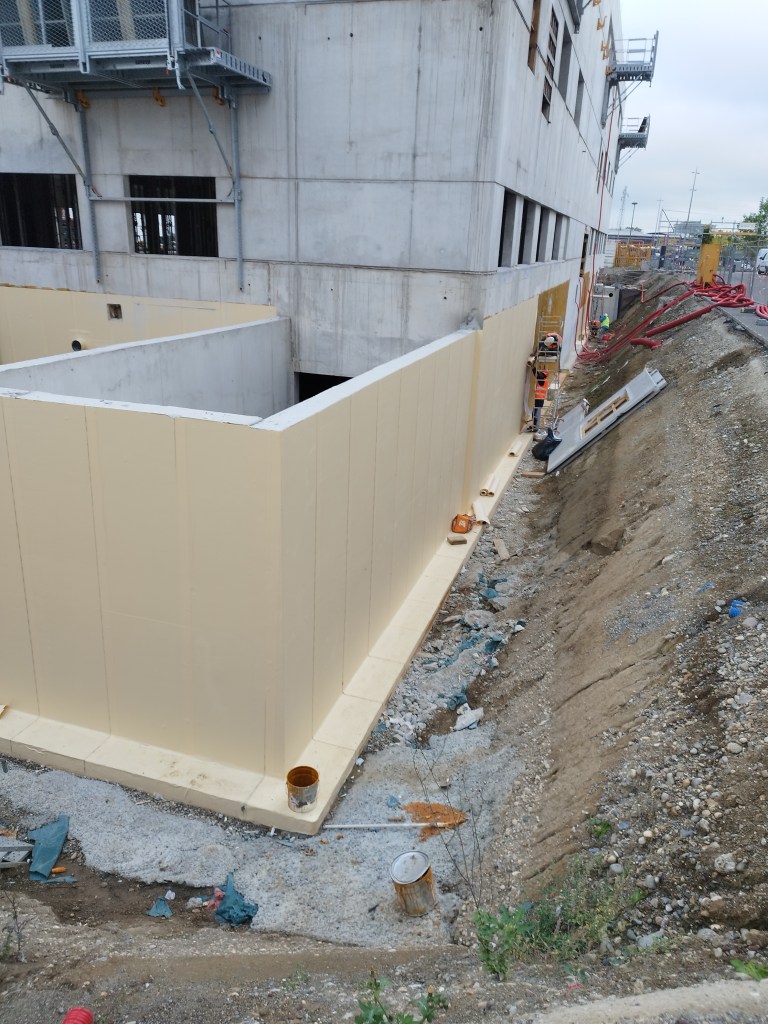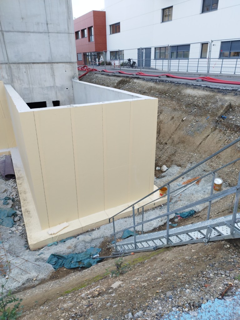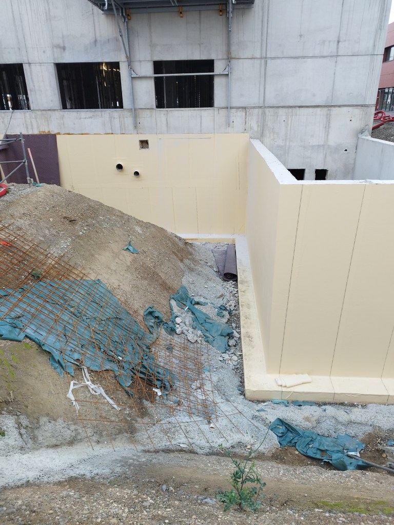 Ce traitement est couramment utilisé en bâtiment ou en génie civil, pour les ouvrages enterrés (radiers et voiles), galeries techniques, fosses d’ascenseur ou locaux nobles en infrastructure. Il est mis en œuvre en voile soit avant remblaiement, en adhérence directe par collage sur béton durci soit sur support béton de propreté en radier ou en voile, par adhérence sur béton frais, lorsque les limites d’emprise du chantier sont trop contraignantes pour des terrassements larges.